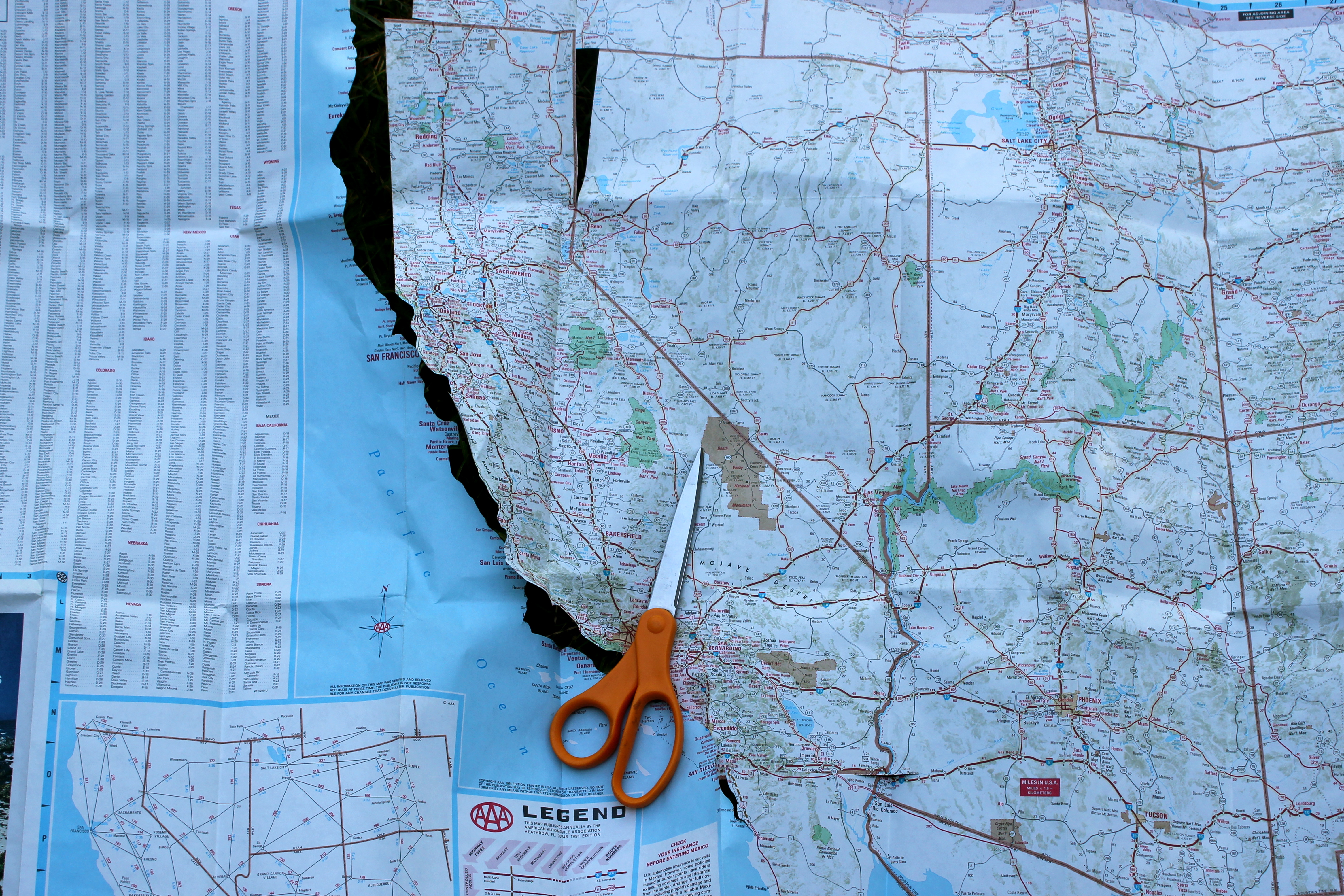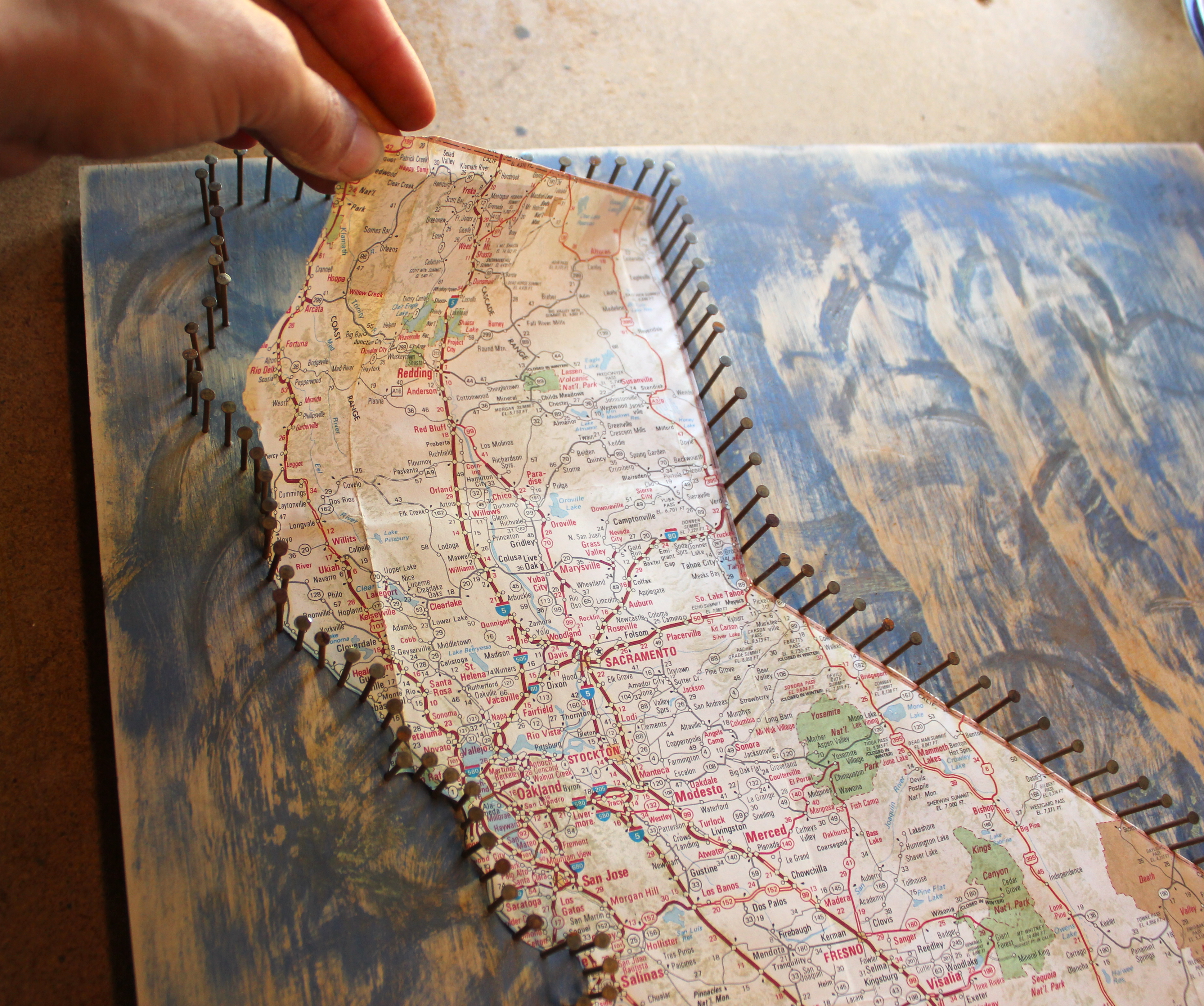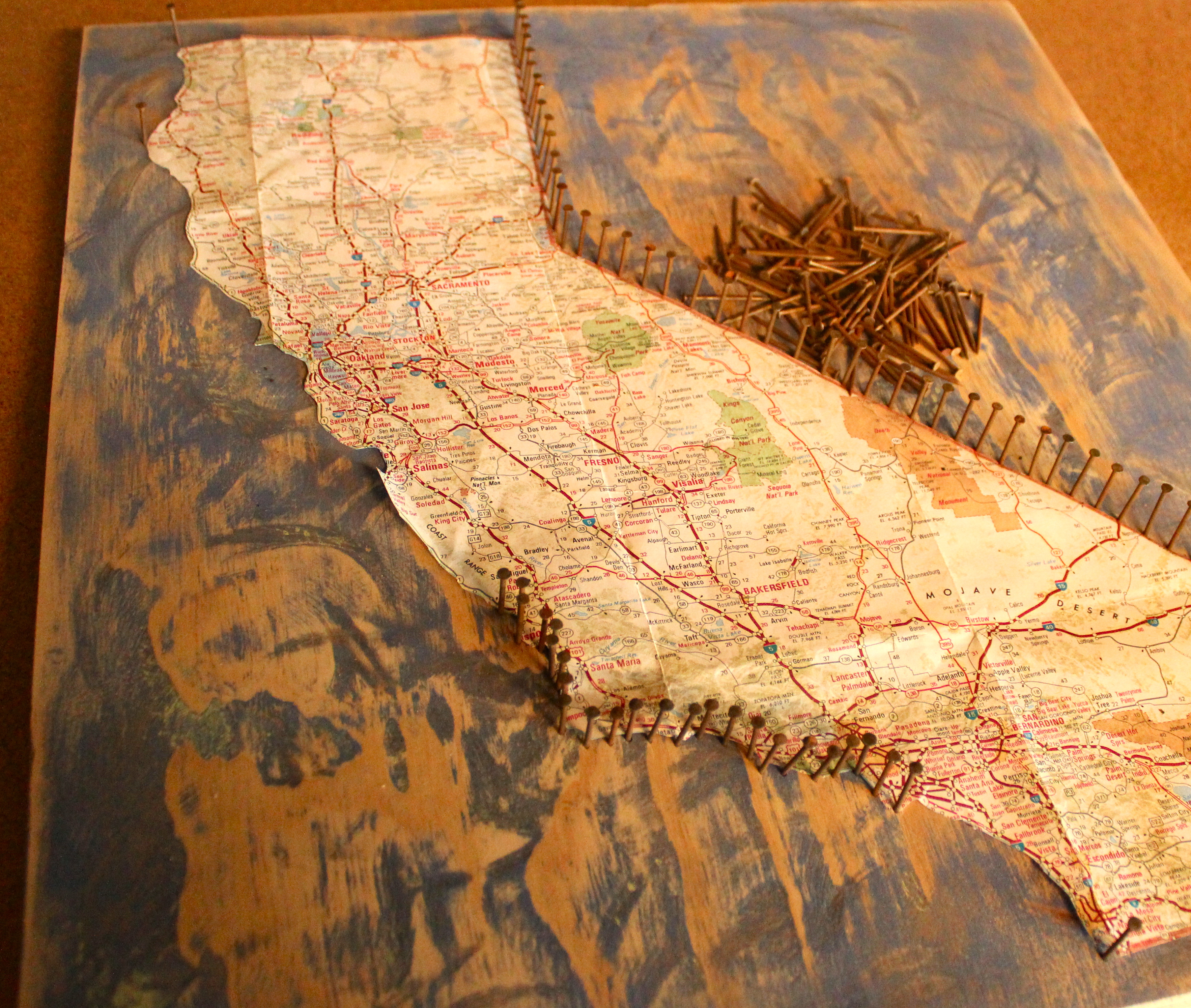 What you’ll need: A cutout of a state of your choice, a board or wood the size that will frame the map cutout, power tools if you need to cut wood, nails, a hammer, string, painters tape (blue tape), music, and maybe a beer.