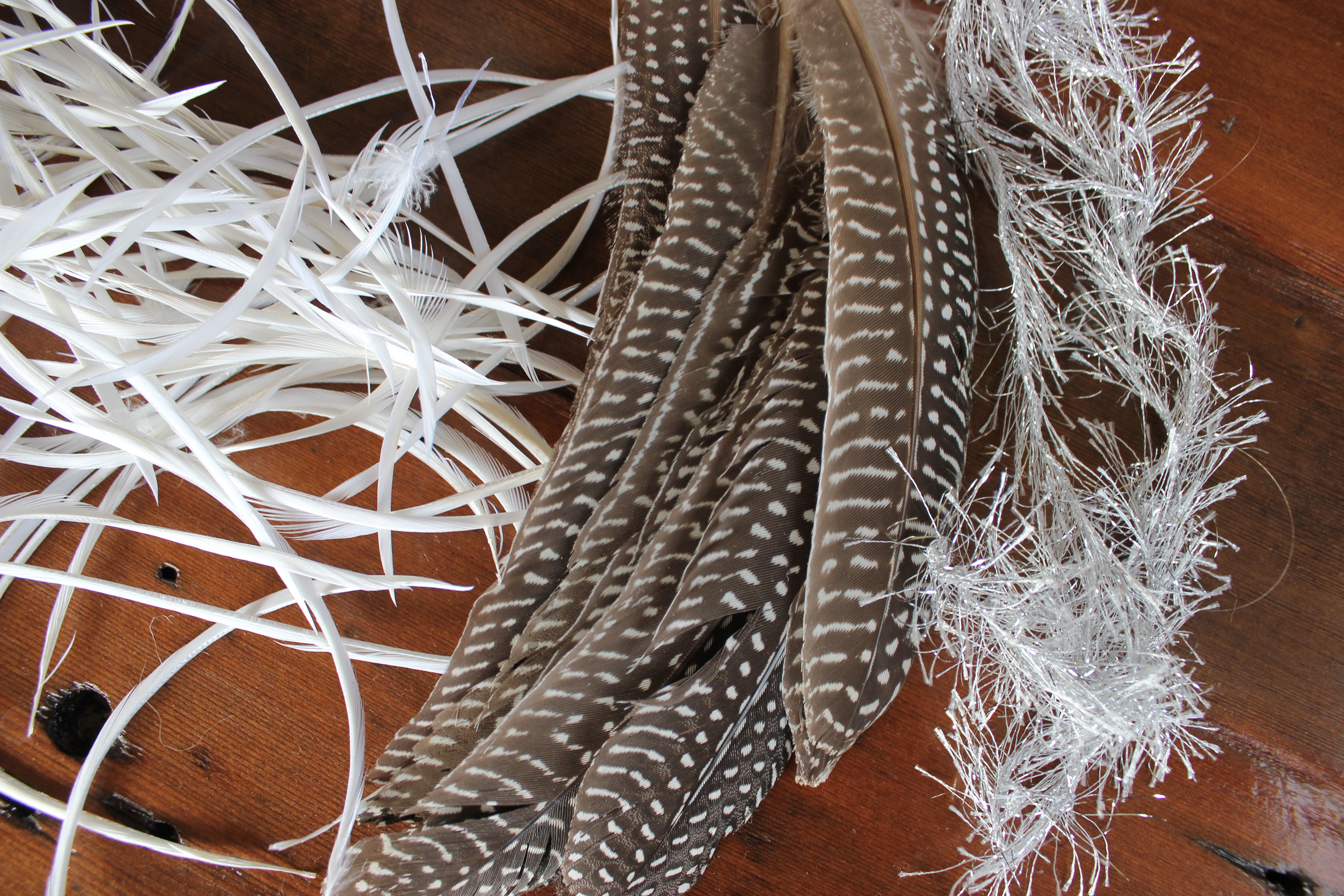 For the third type of ornament, you’ll use the goose feathers and the guinea hen quill feathers