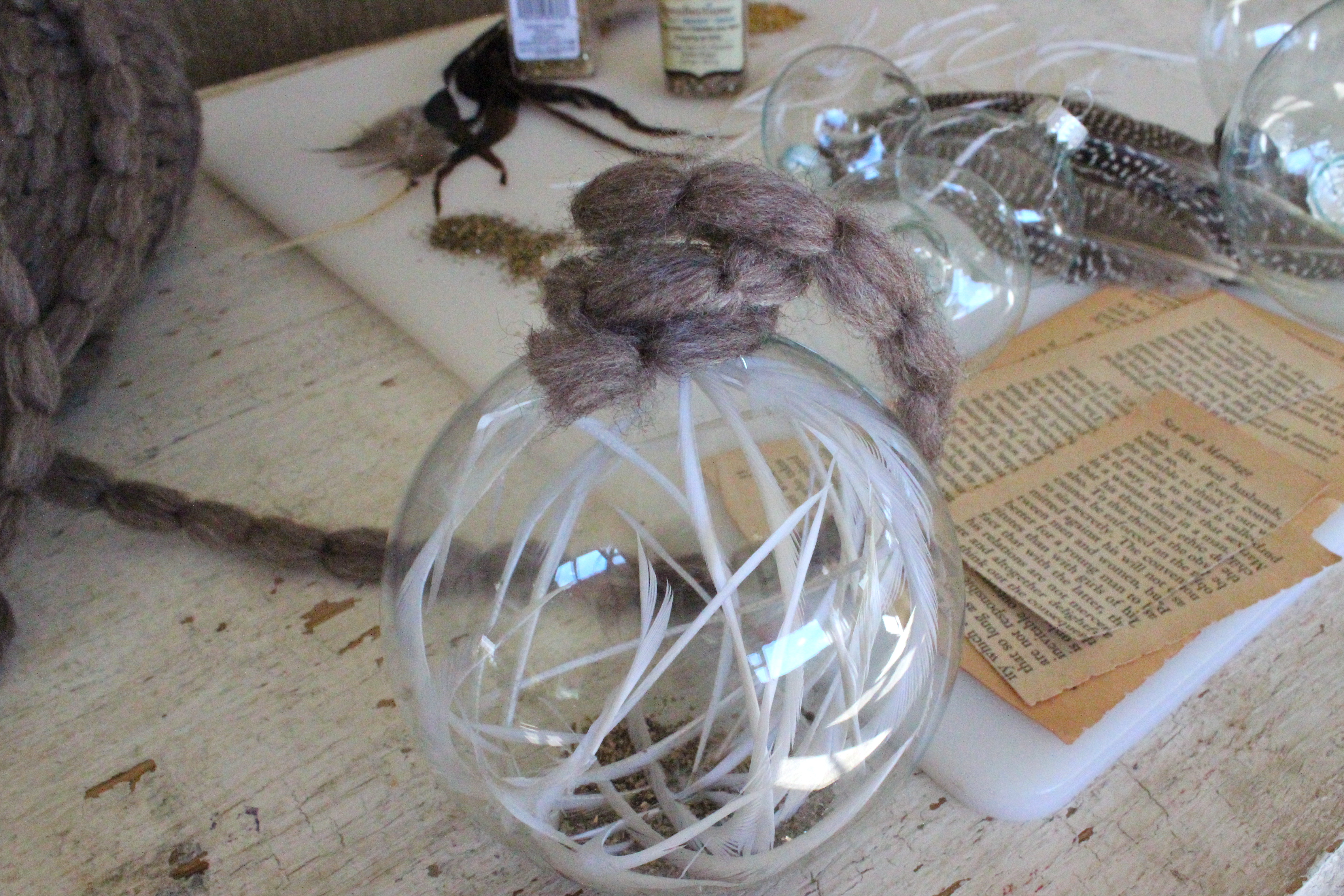 For the next type of ornament, you’ll need the goose biot feathers, glass glitter and yarn
