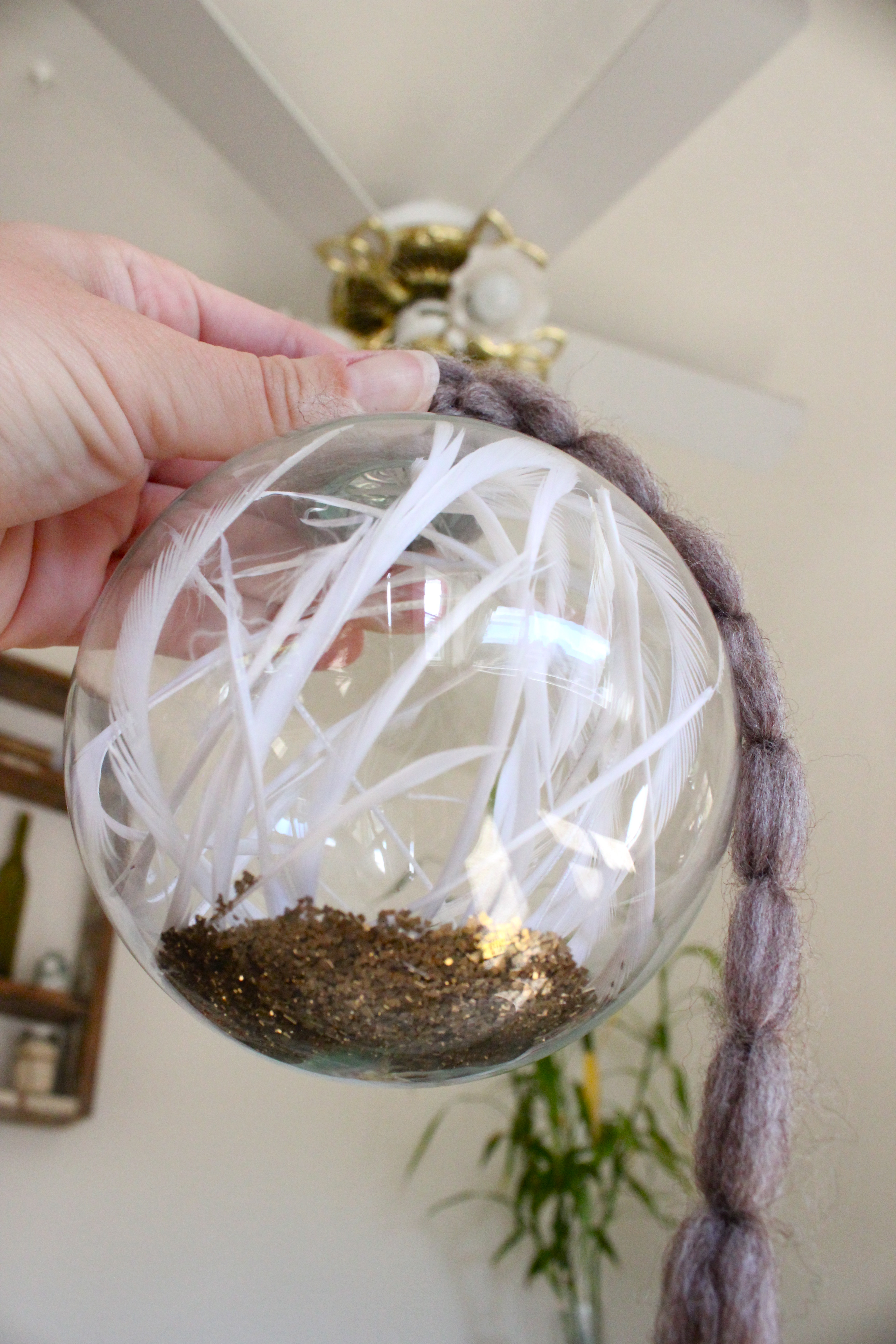 1. Start by inserting the goose feathers into a round ornament. Luckily these feathers perfectly form to the round inside of the ornament. Makes it so easy!