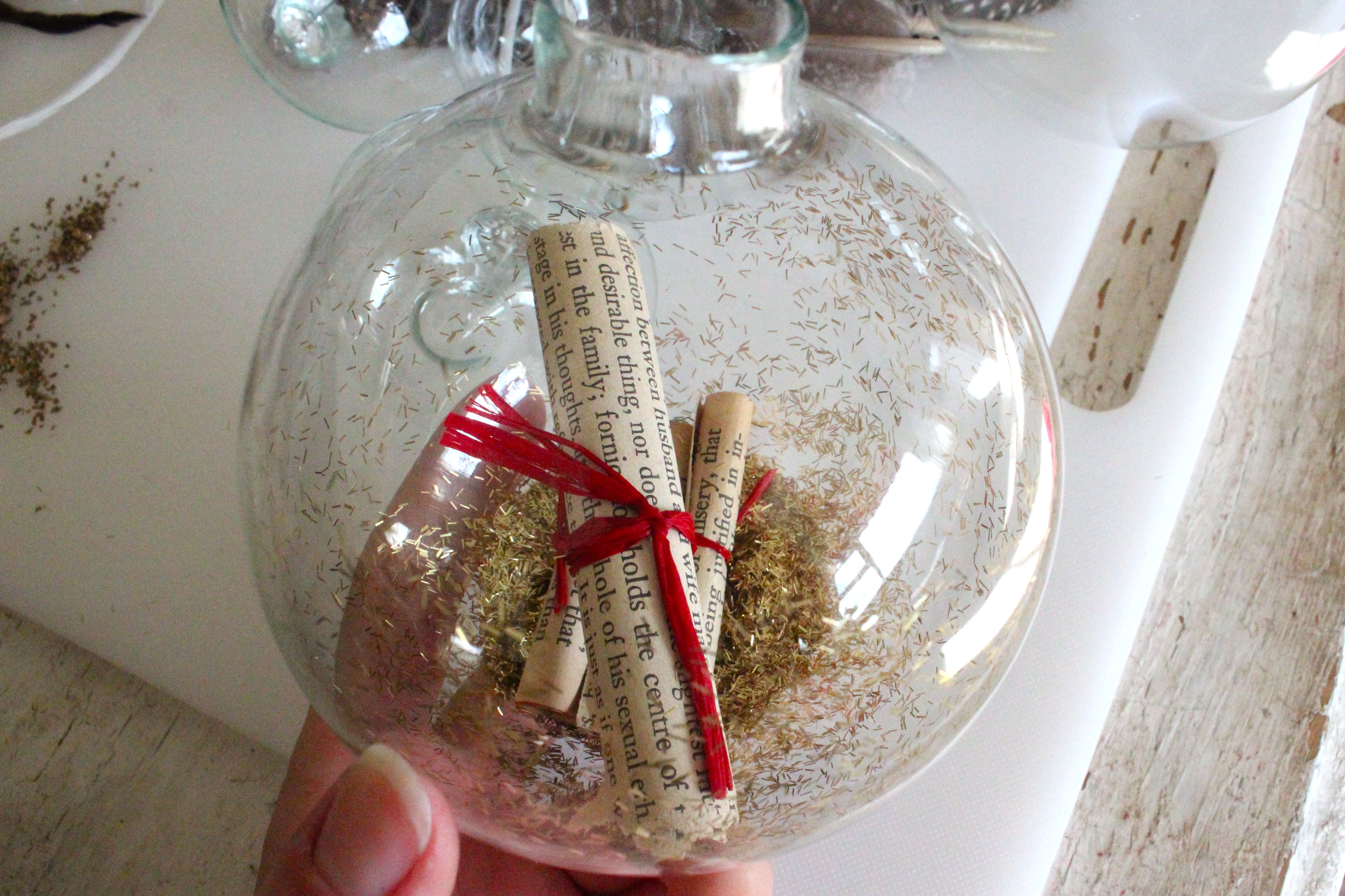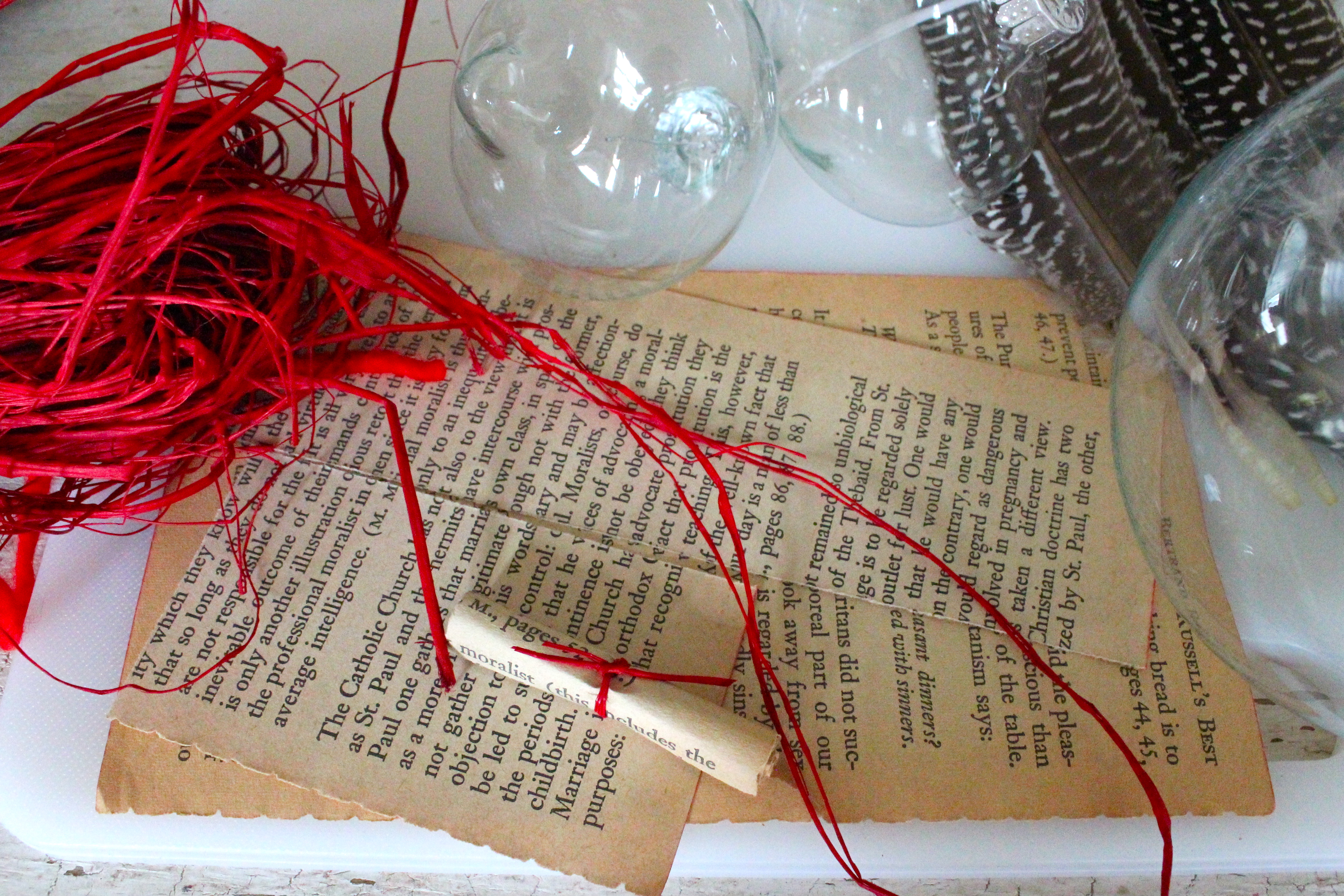The first type of ornament uses the old book pages, raffia, tinsel glitter and a round ornament.