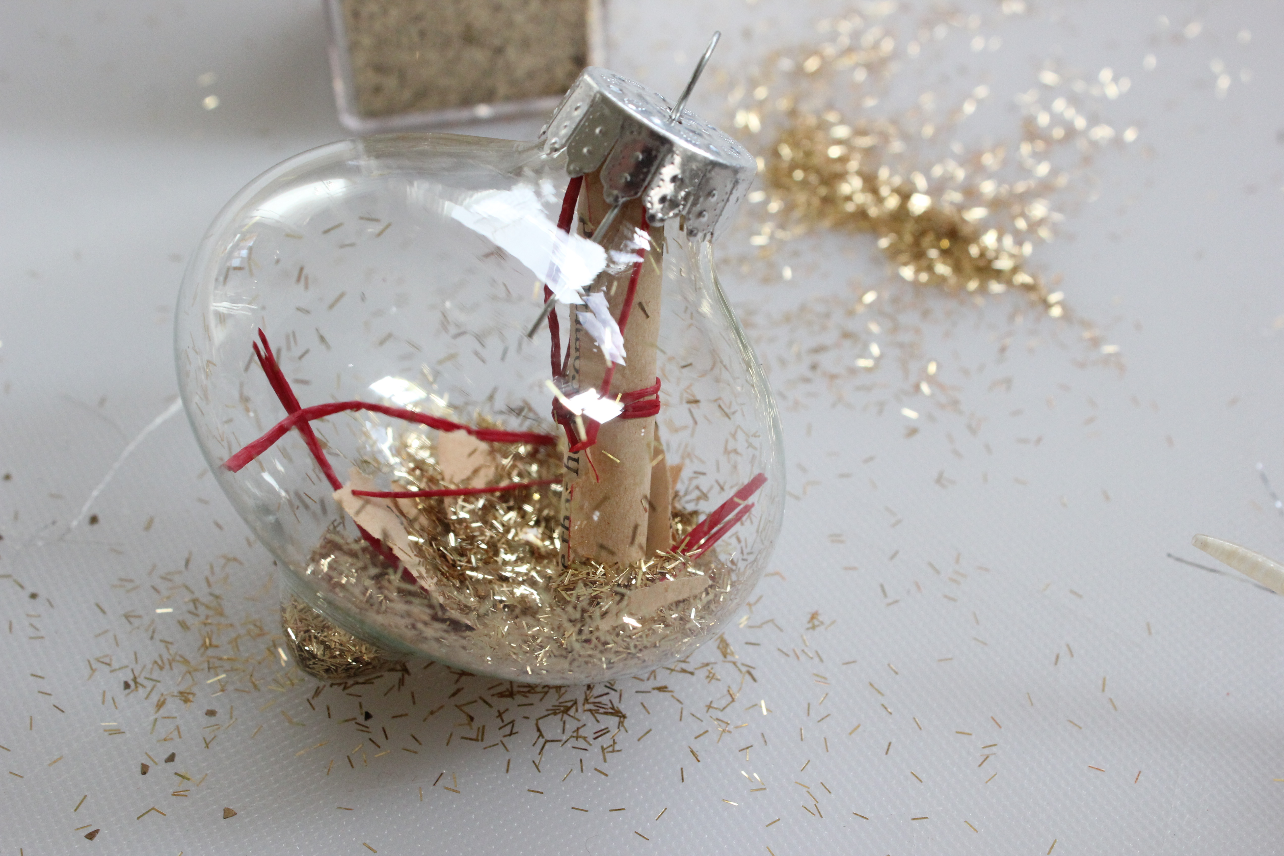 5. Pour the tinsel glitter (about 1 tablespoon – or more depending on the look you want) into the ornament and shake with your finger covering the opening. The tinsel glitter will lightly stick to the sides of the ornament.