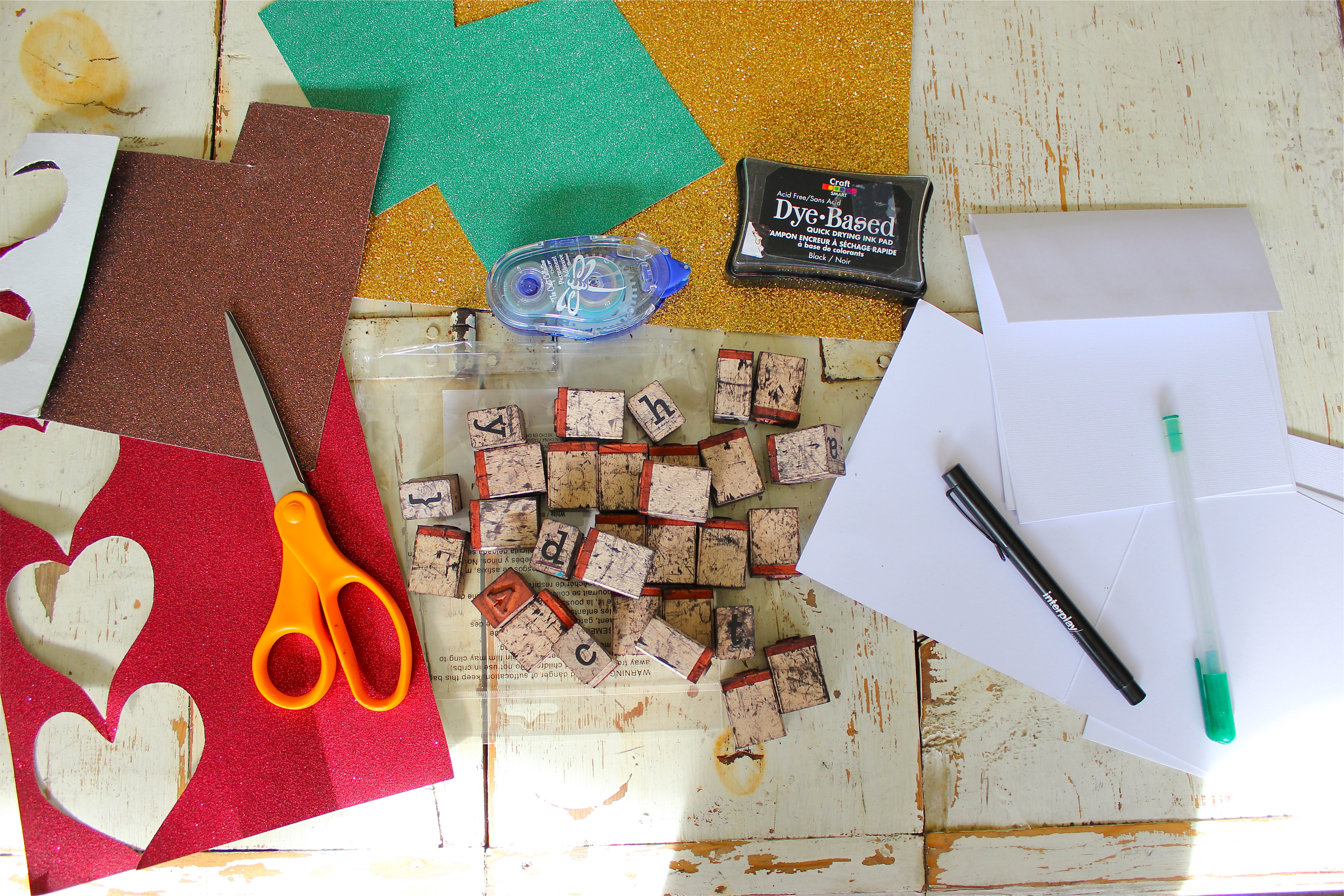 letter stamps / colored paper or card-stock (I prefer card-stock) / ink-pad / scissors / permanent adhesive tape roller / blank envelopes and cards / pens