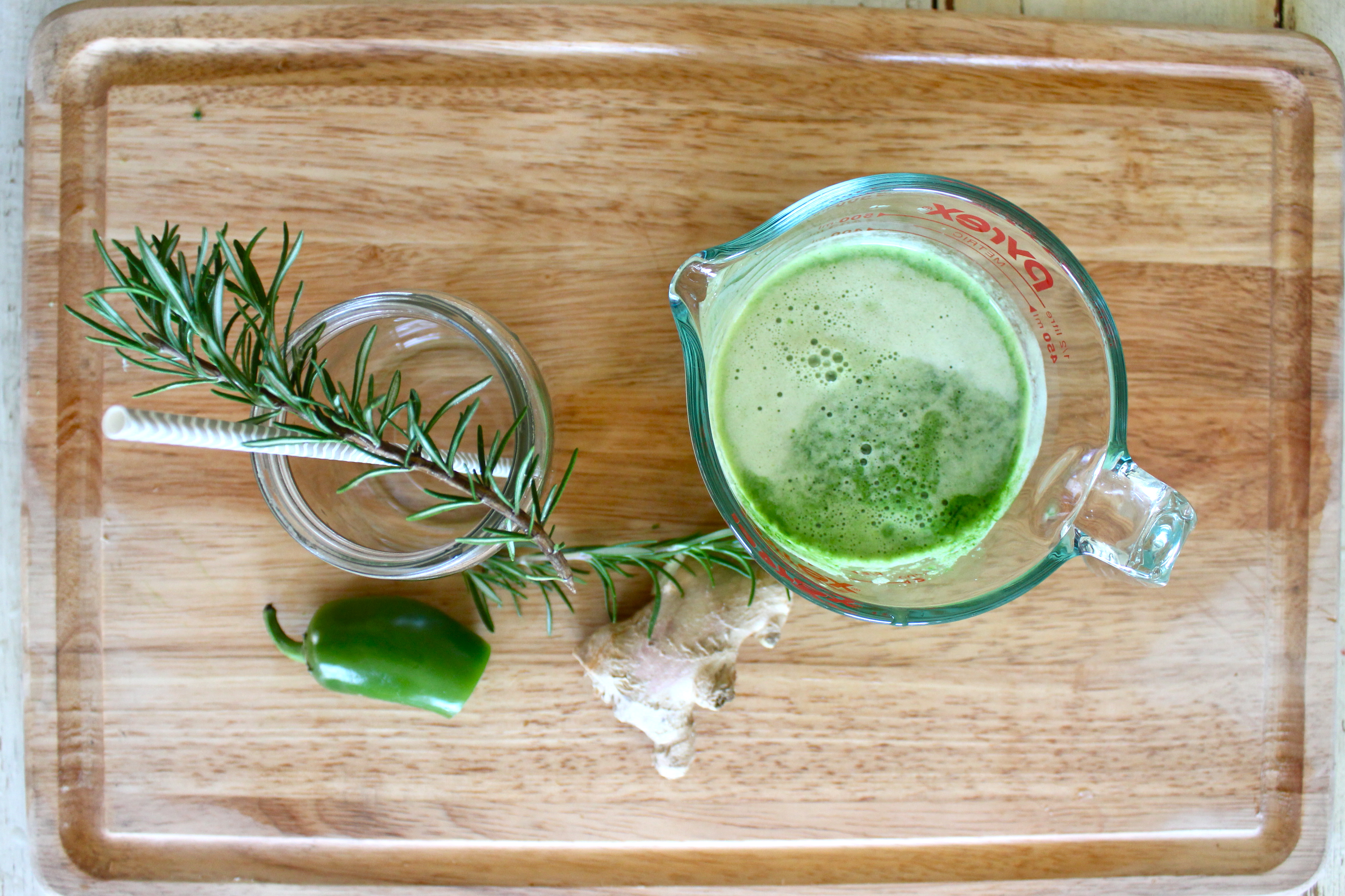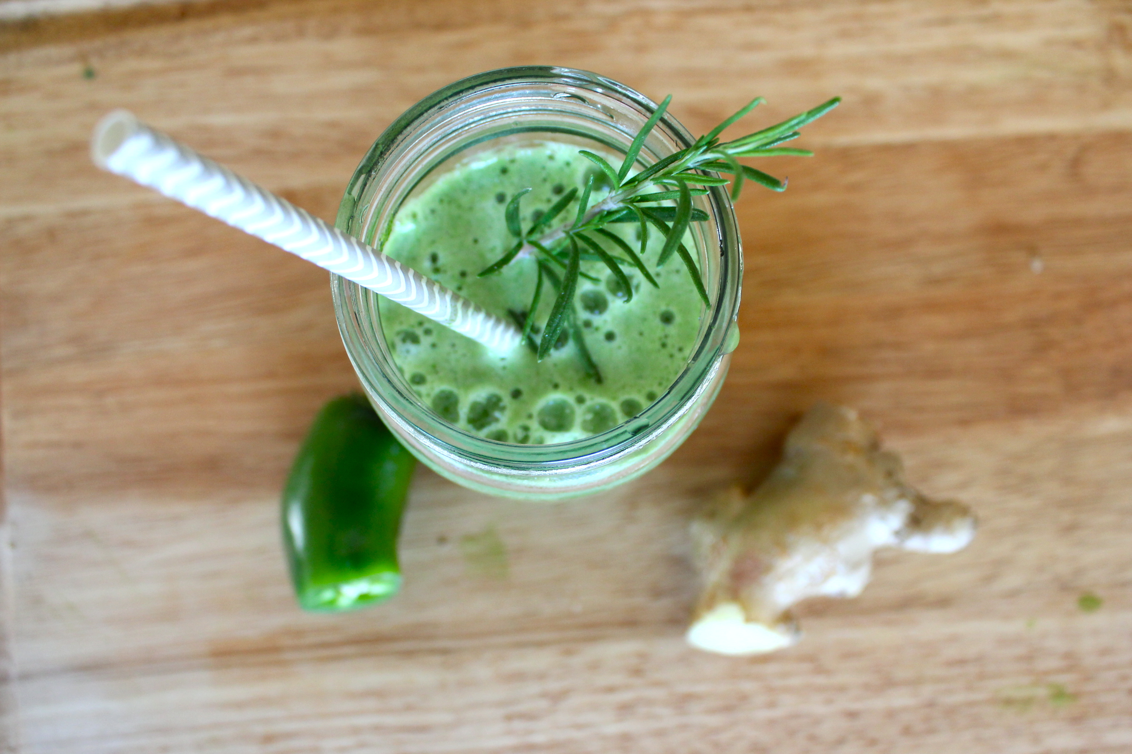 Ingredients: kale, green apple, ginger, jalapeño, small cucumber