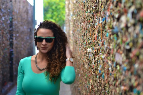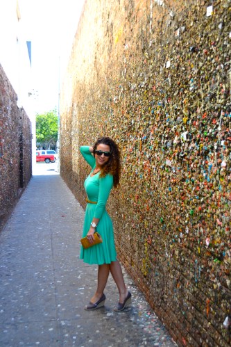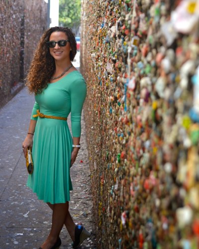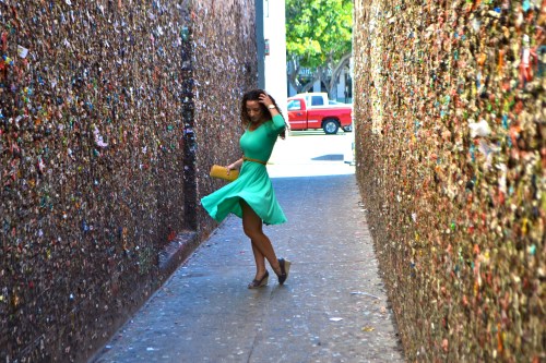 This shoot was done with Easter in mind. This dress is a color green that screams Spring, plus it’s so fun and flow-y. Between the color, style and feel of the dress, combining it with a shoot in San Luis Obispo’s Bubblegum Alley seemed like an appropriate Easter thing to do.