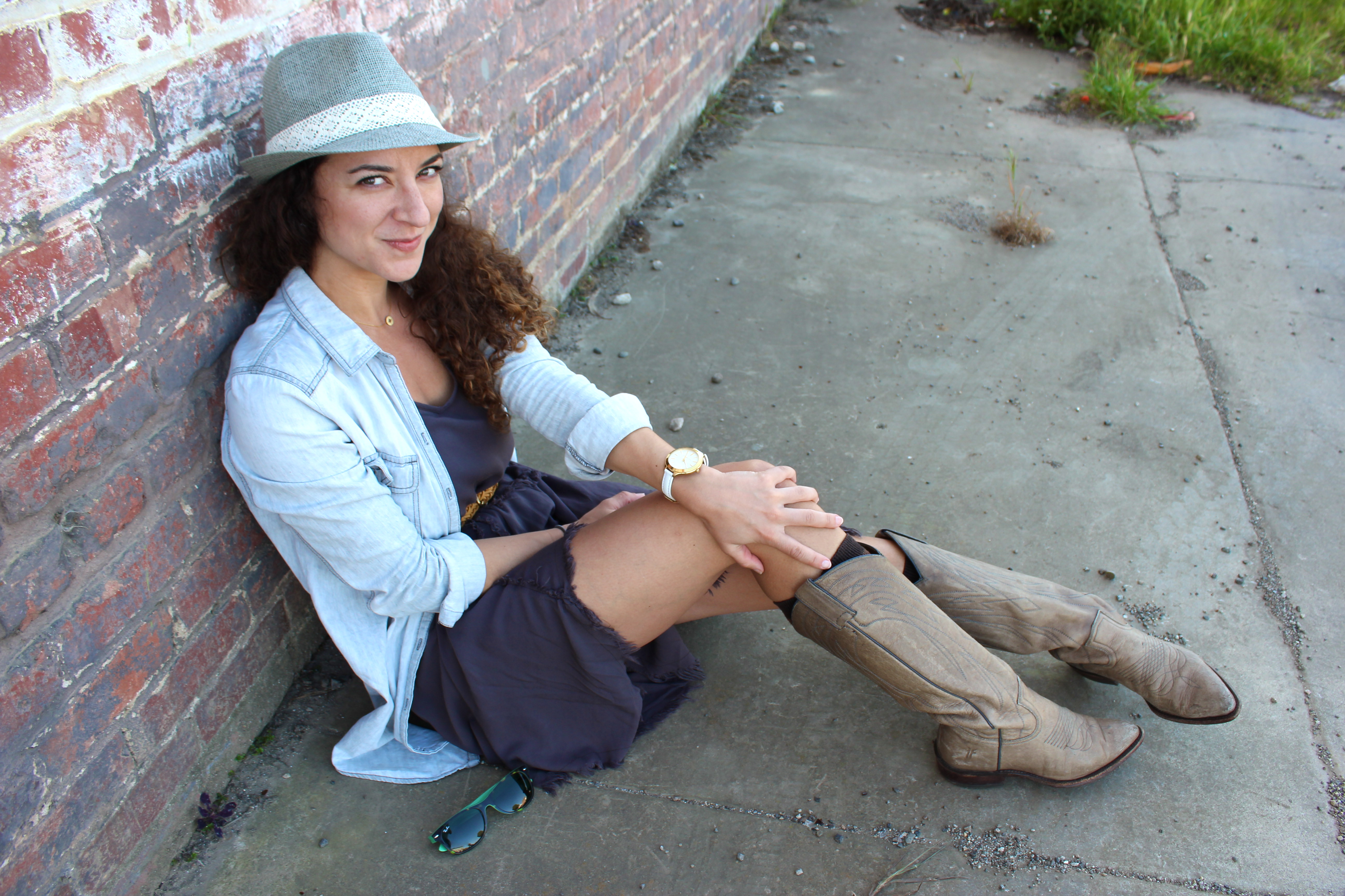 {Free People Tattered Up Shred Slip, Nordstrom Chambray, The Hatter Co. Fedora (similar here), Frye Boots (similar here), Hobo Wallet}