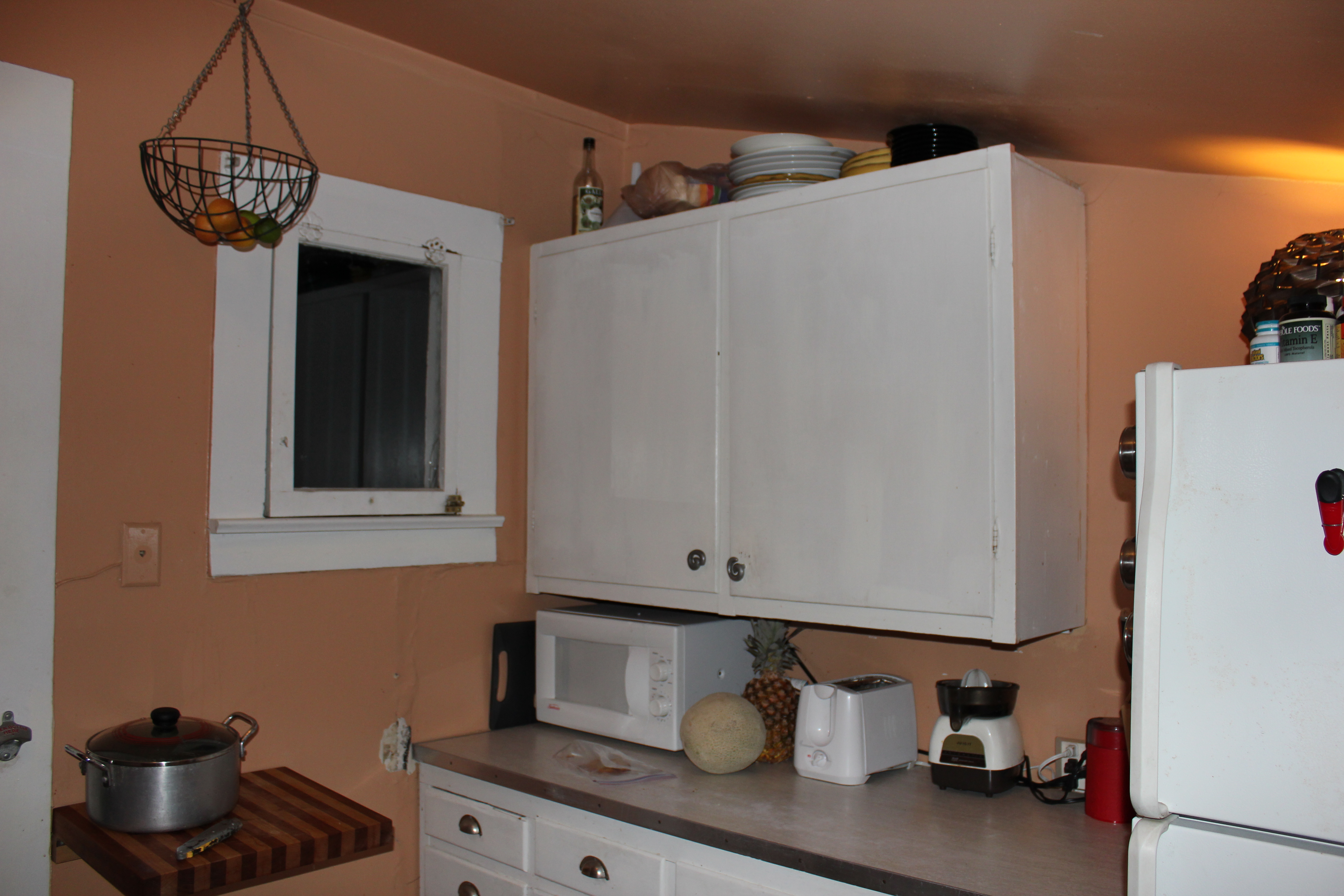 The floating cutting board was a creative idea, however, in this kitchen, with limited floor space, it took up even more unnecessary space. After discovering there was (cough) mold growing and the top layer of paint/plaster was peeling up, we had to cut away a big portion of it and re-plaster the wall.