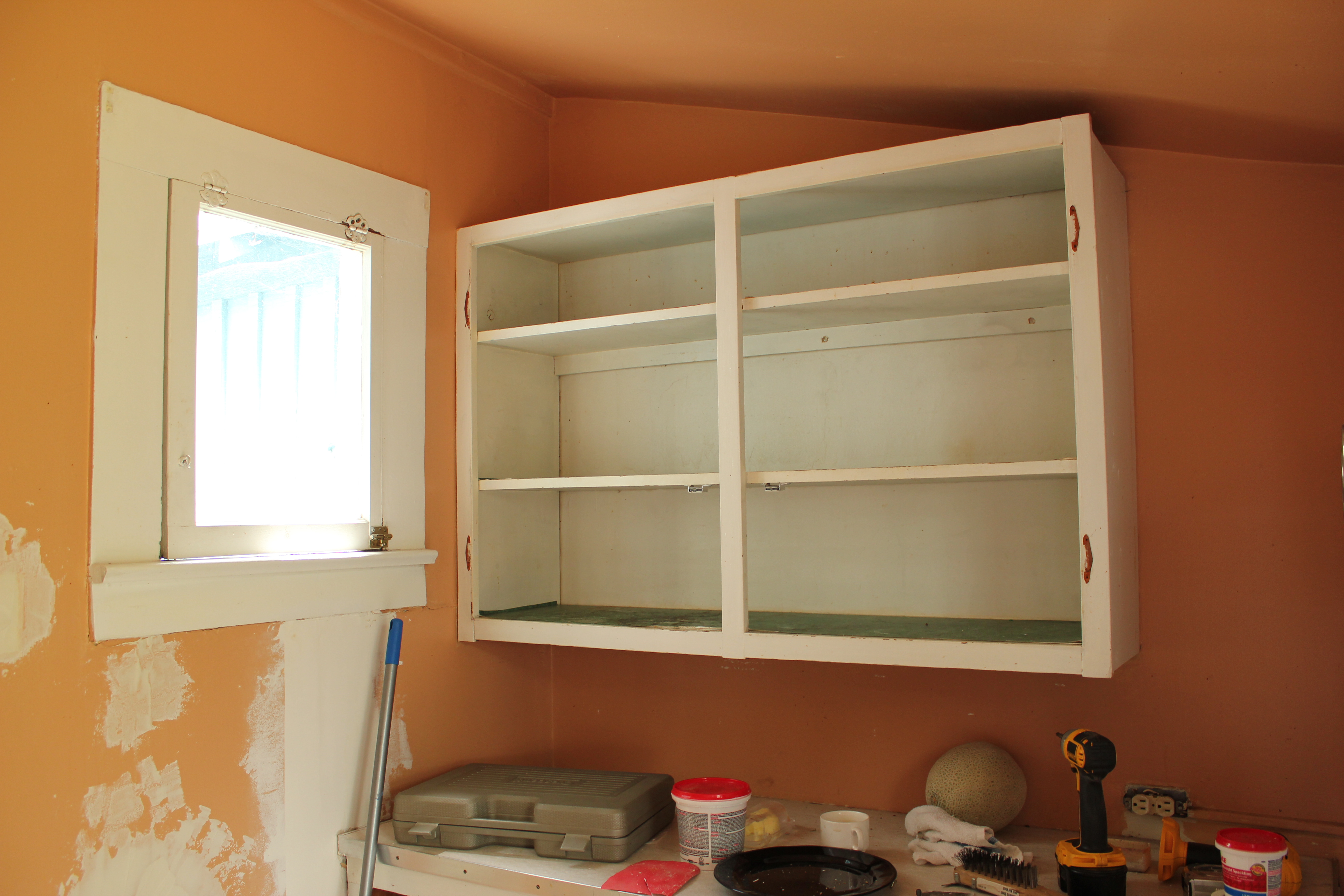 After realizing this shelf on the right above the sink was probably the best thing for that space, and fit in with the open shelving concept, I still knew I wanted to repurpose it. And that shelf above the door? Immediately removed and discarded. No one needs shelves above a doorway – talk about shortening and cutting off space!