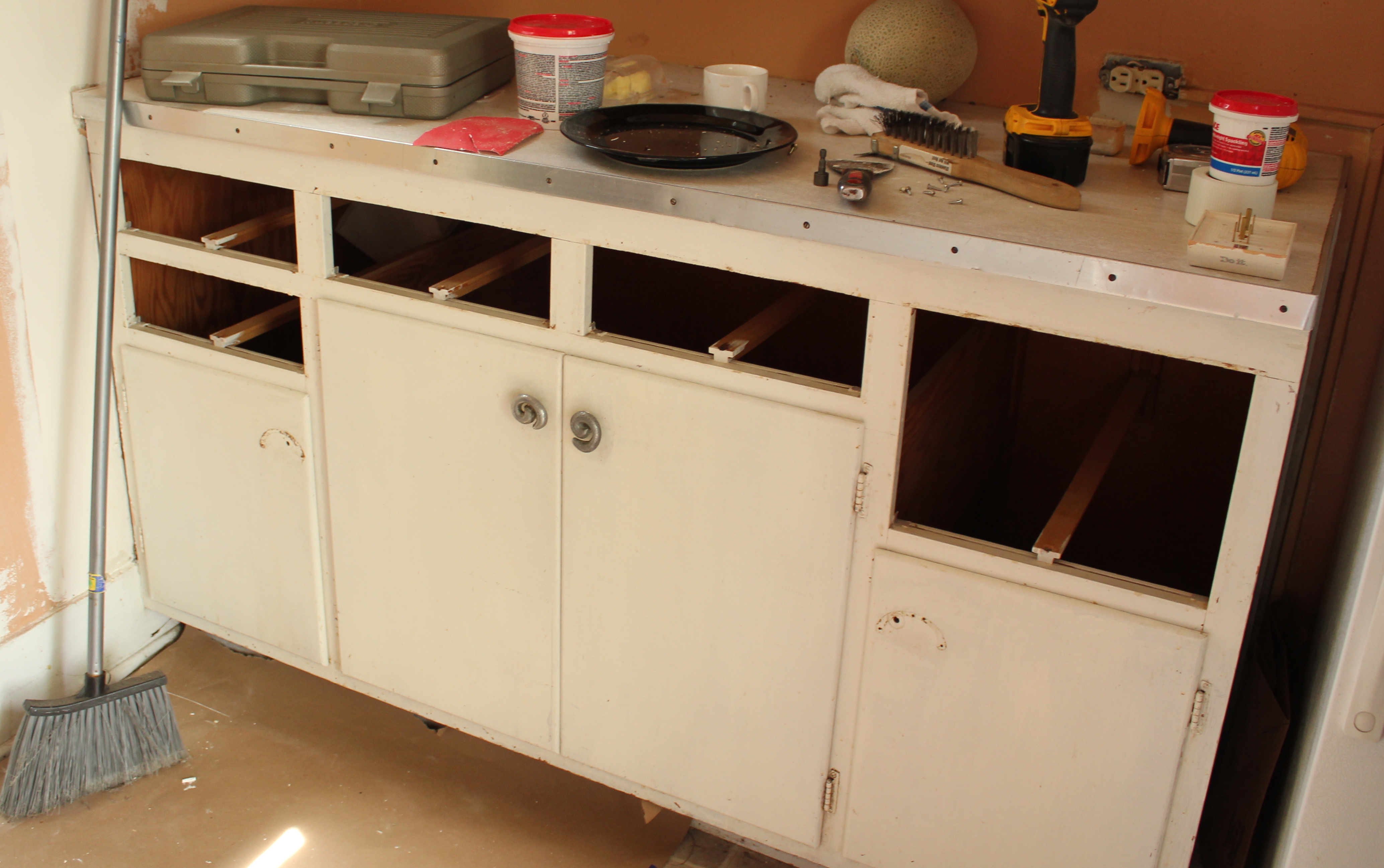 After sanding the painting the fronts of these cabinets, I was about to paint the backsides when I realized that the worn, refurbished look appealed to me more – PLUS that meant I didn’t have to take twice the time or paint to ‘finish’ painting them!