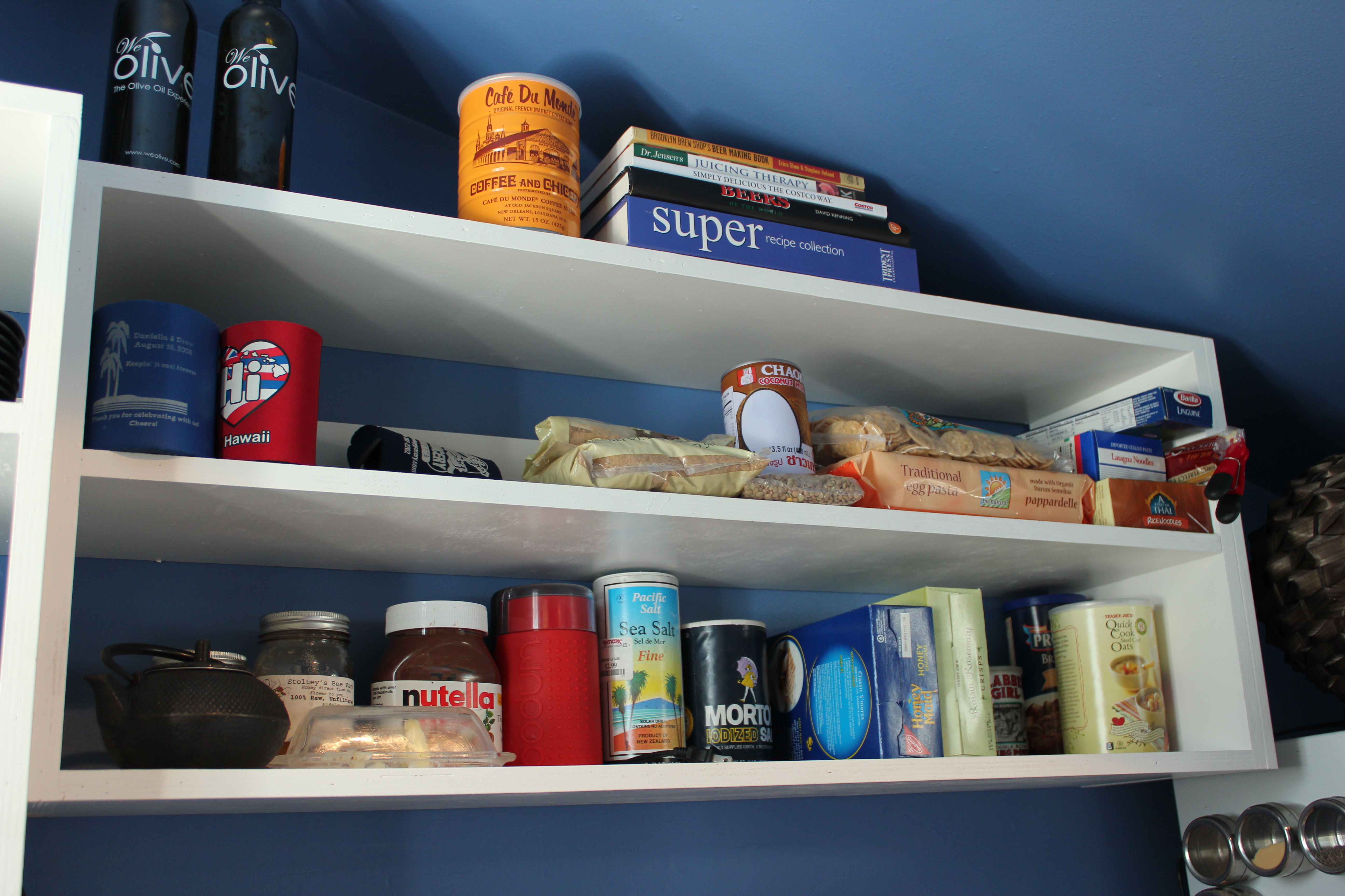 I knew right away, this shelving unit needed to change. It took up more space than it should and the cabinet doors made the function difficult. I decided creating a custom open shelving unit would maximize and open up the space.