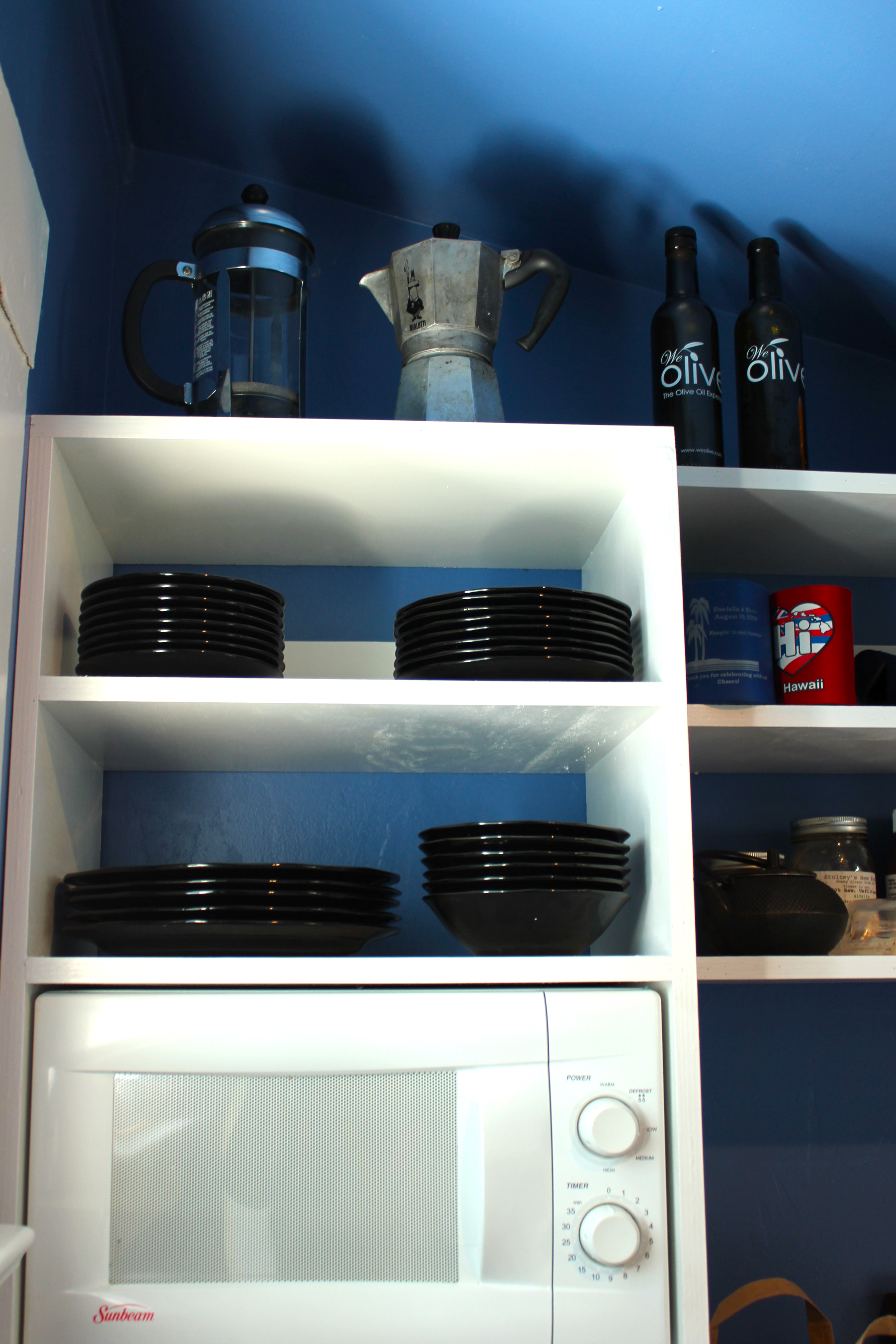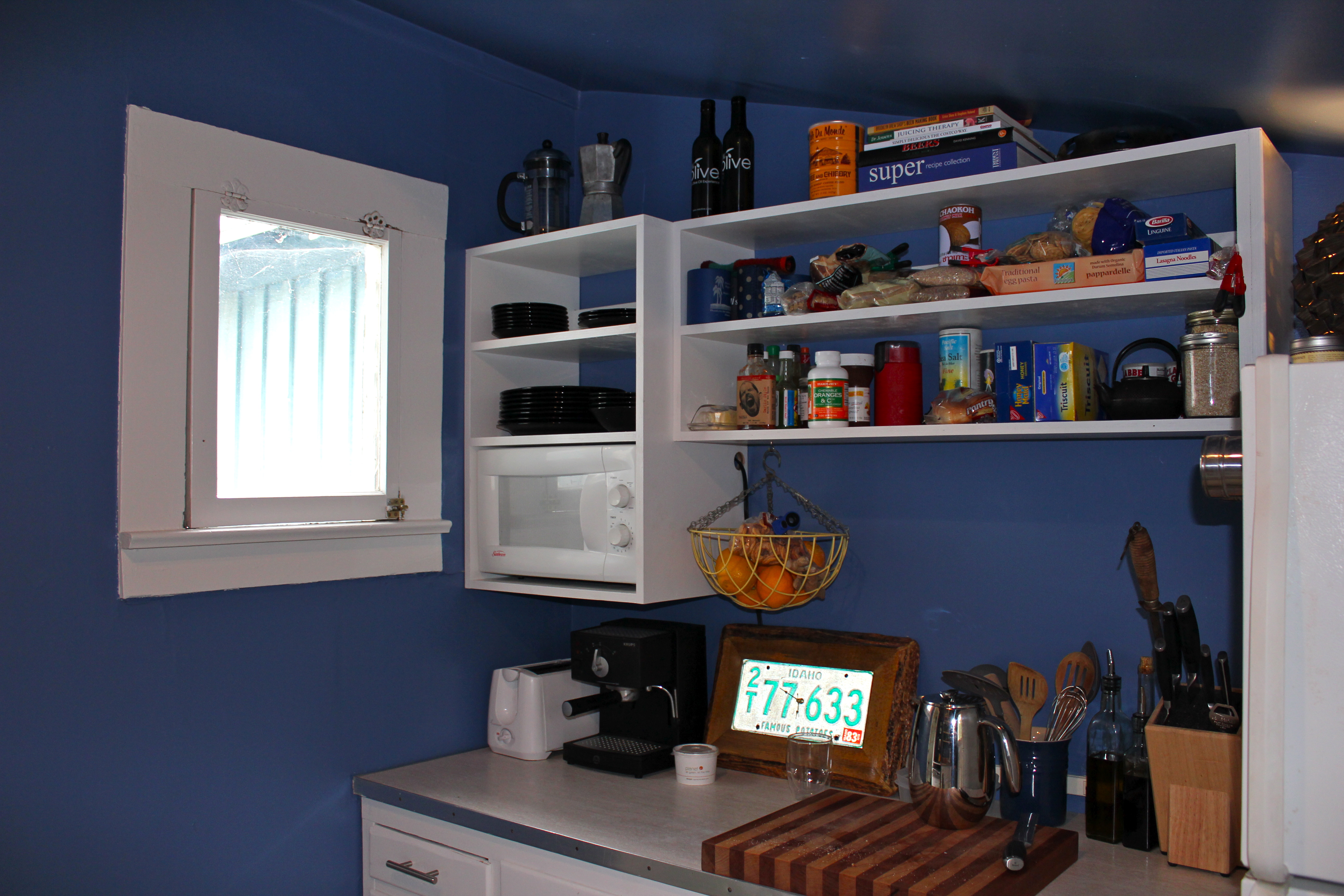 This custom open shelving unit, created more storage and by creating a custom cubby for the microwave, it gets it off the counter, opening up prep and cooking space.