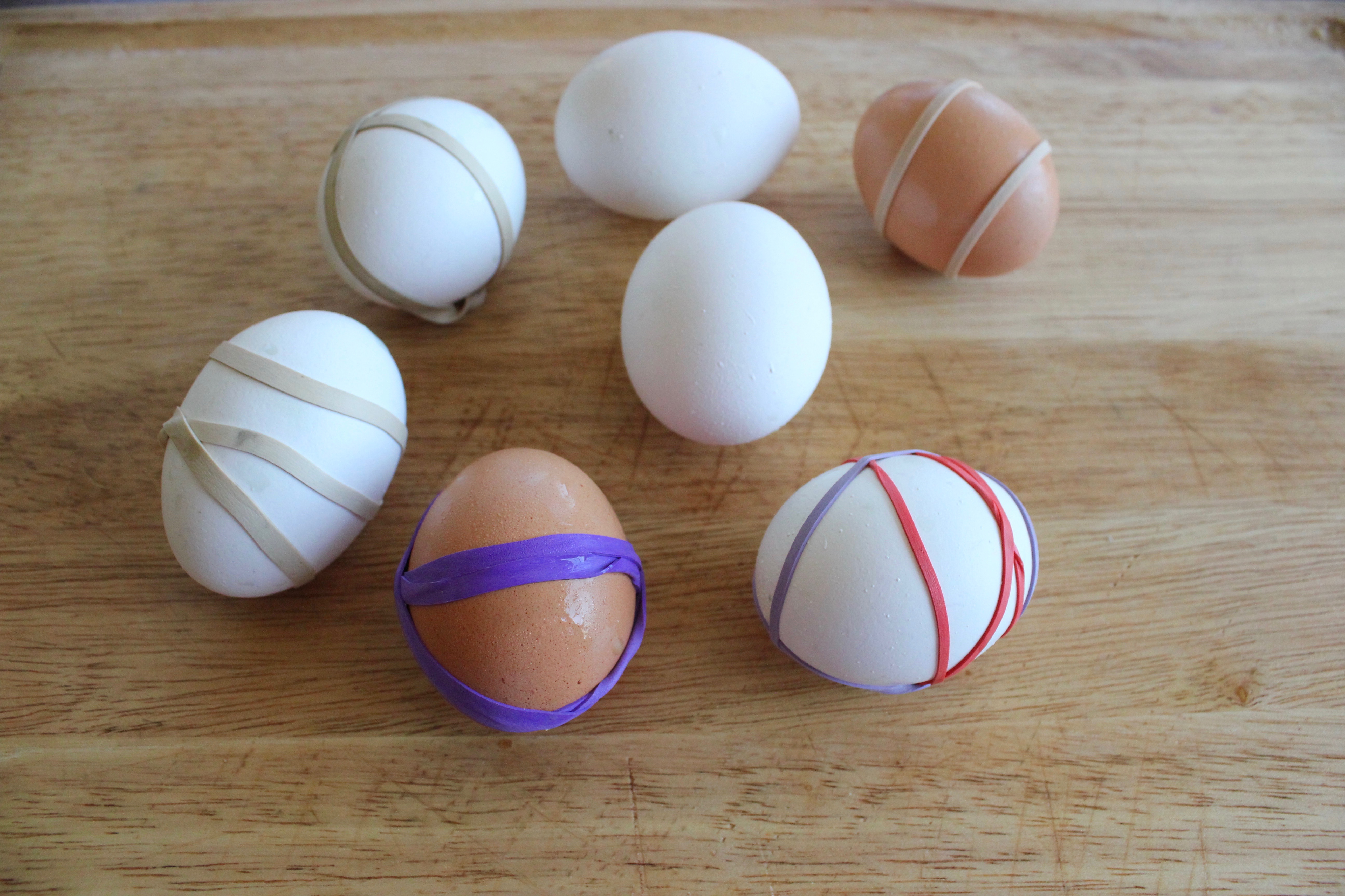 {To create designs on the eggs, I used rubber bands, unfortunately only 3 eggs retained their rubber bands throughout the boiling process…If you were to boil the eggs separate and just add them to the dye to soak, the rubber bands will remain intact}