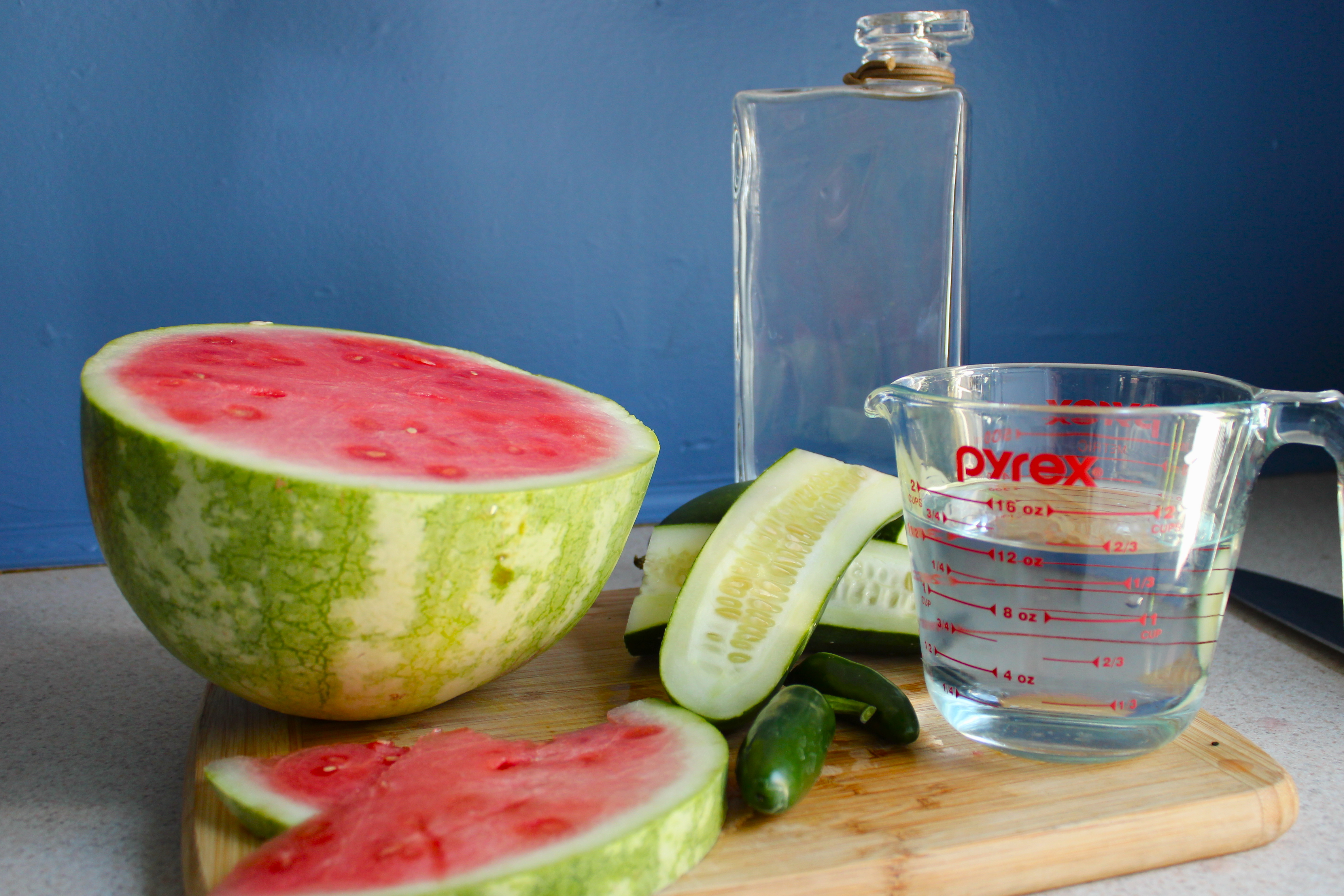 I know that Tequila is great, but it does not allow for a plethora of cocktails to be made with it. I am hoping this infusion will spice it up a bit. I had watermelon leftover from an Agua Fresca I had been making so I used that, picked some cucumber and jalapenos from the garden and went to town.