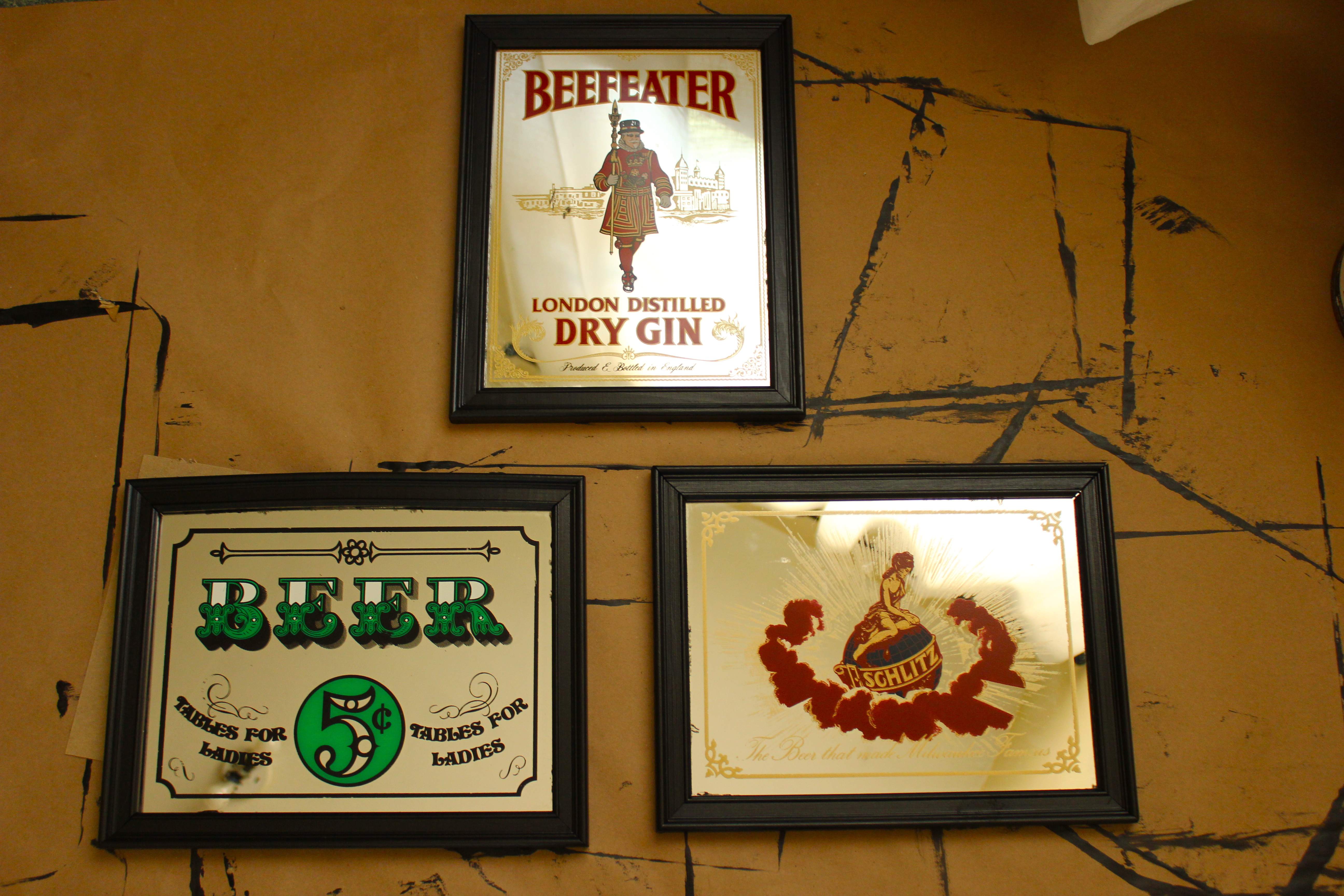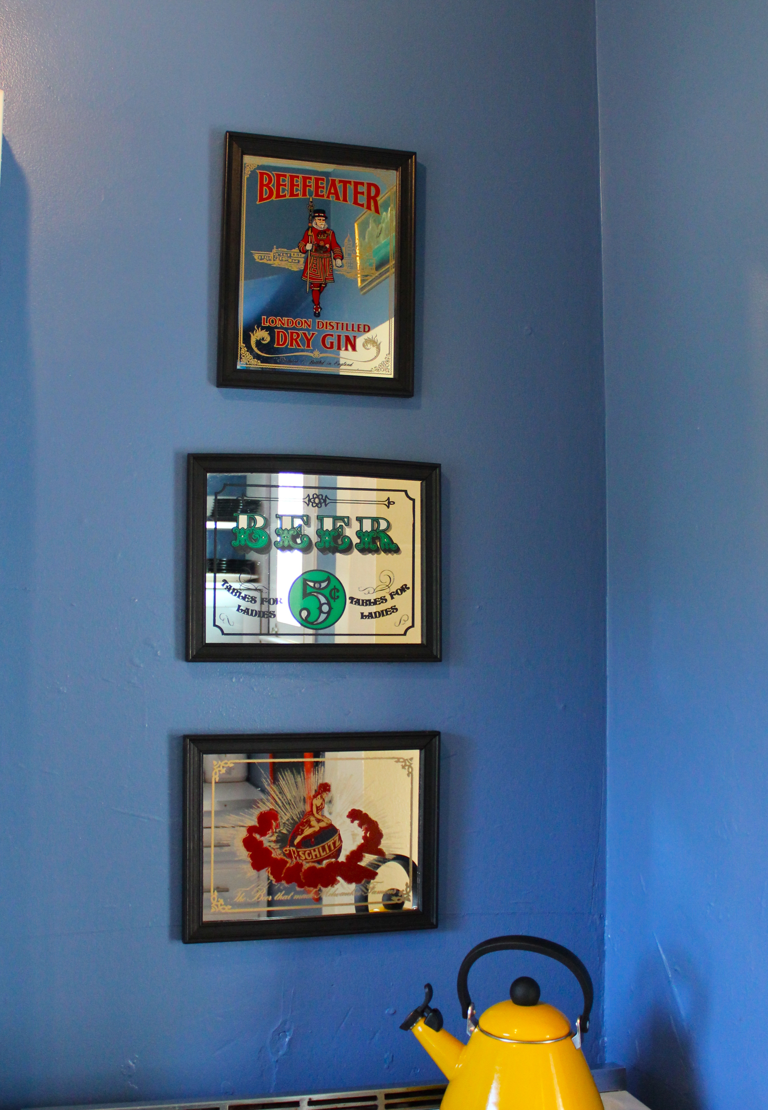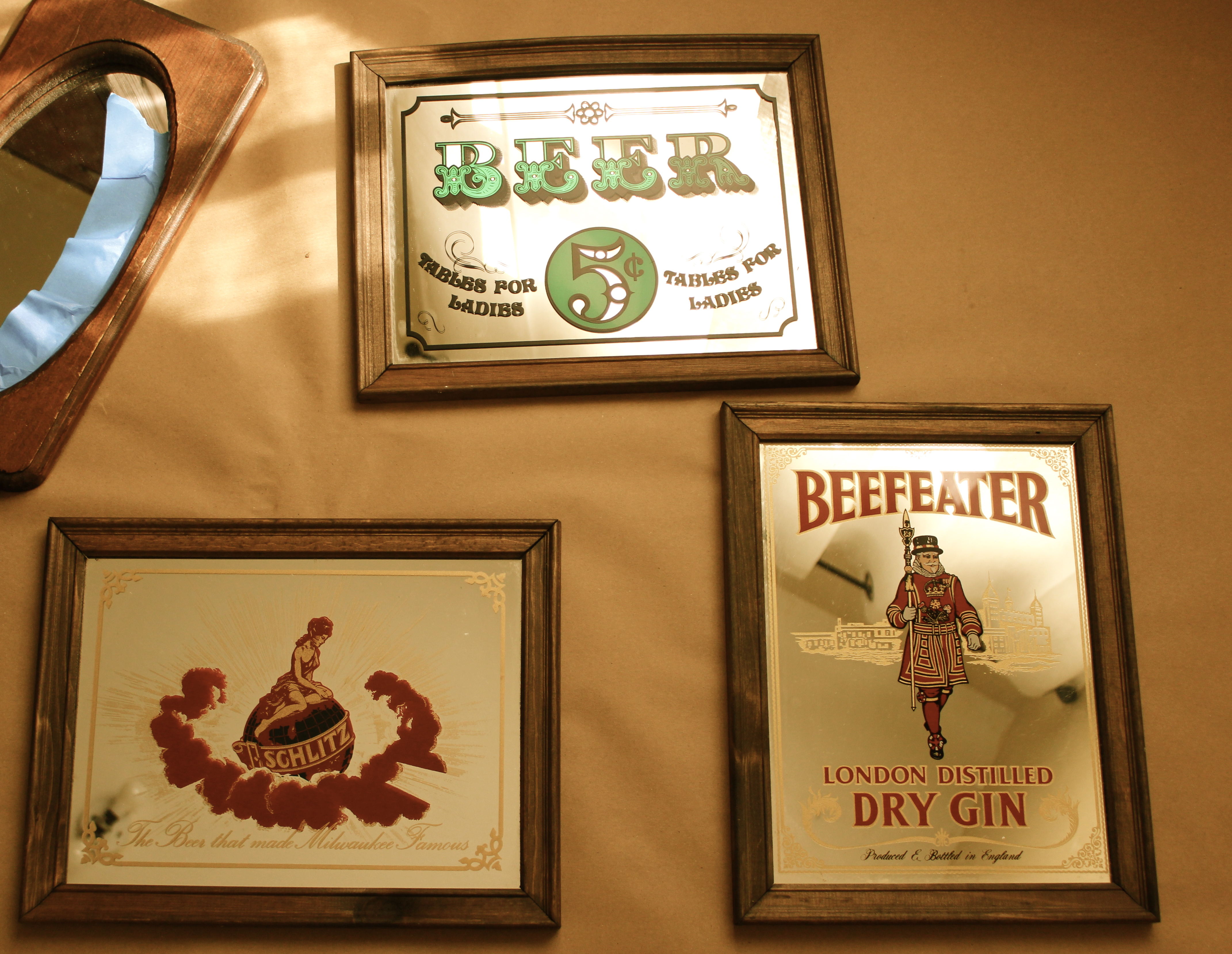 Recently, our kitchen went through a much-needed, massive facelift. It felt so good to redo, repaint, and visually enlarge the space. Part of the challenge was to find mutually likable decor with an androgynous feel. At the swap meet I found old mirrors inlaid with beer and alcohol brands and designs. These were fitting for a kitchen, where food and drinks are prepared, so I purchased three at a hot price of $5 total and was on my way. I didn’t like the old wood frame look, however, so started manipulating them right away upon arriving home.