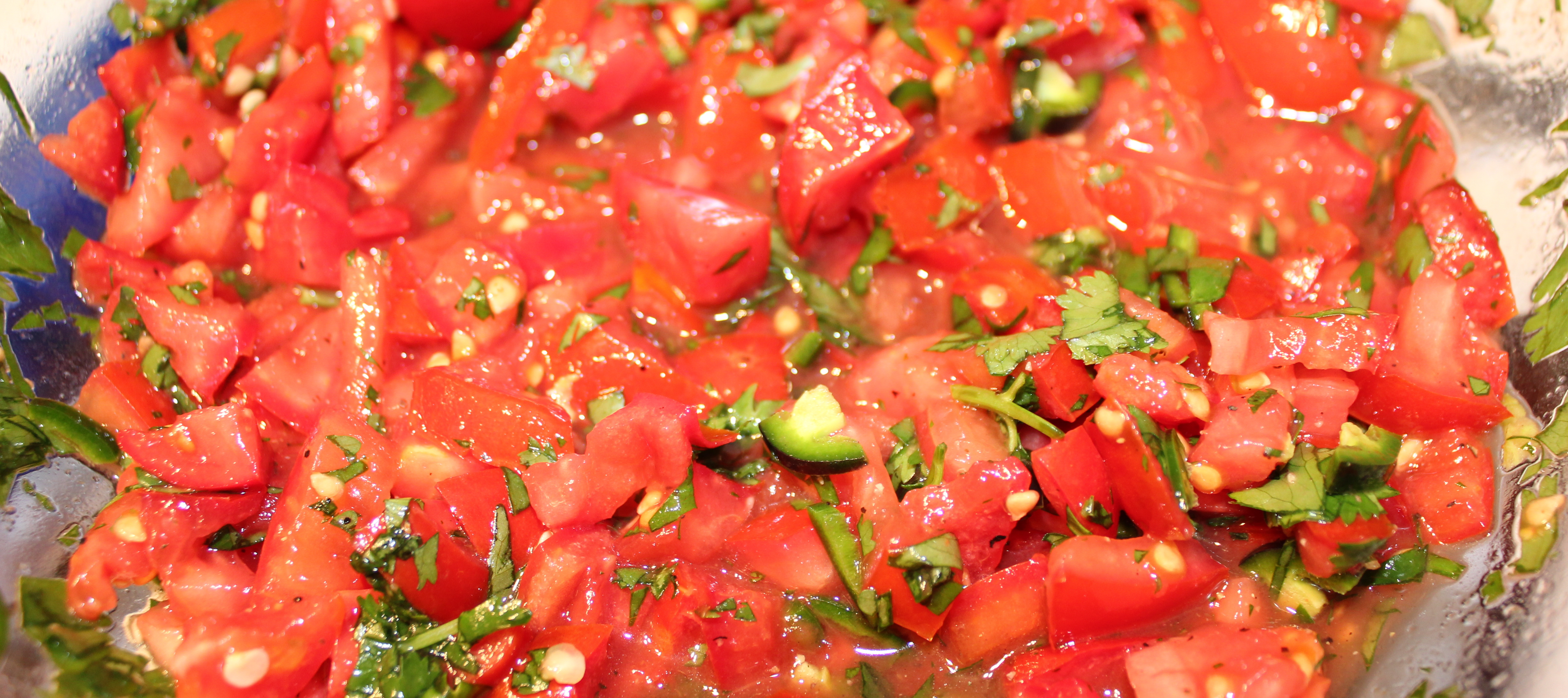 ~ 2 1/2 – 3 cups diced tomatoes (locally grown) ~2 serranos ~3 garlic cloves ~