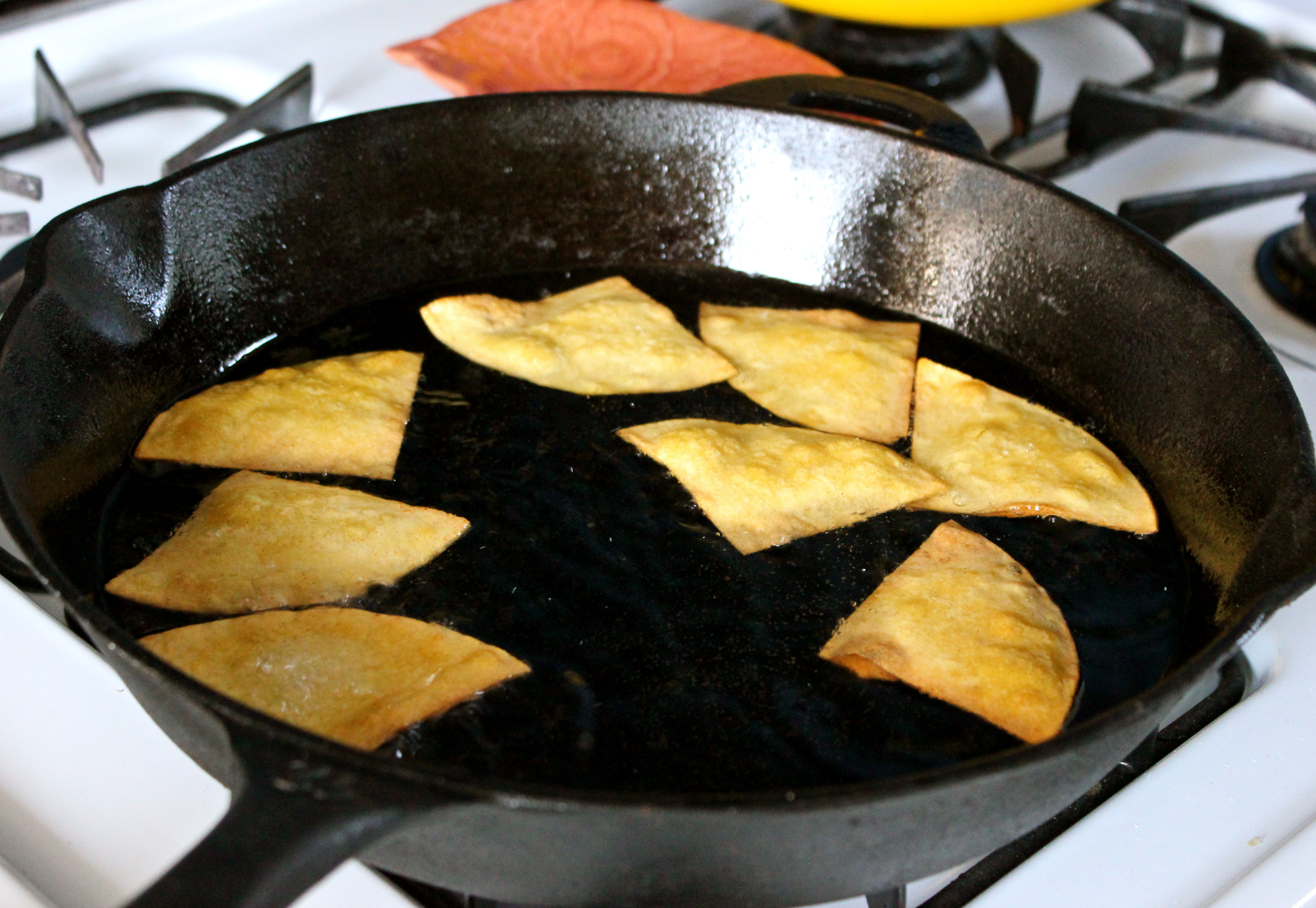 To finish off the salsa, add another homemade touch with freshly fried corn tortillas. Cut the small rounded corn tortillas into fourths. Get a pan (cast iron works great), fill it halfway with oil, and turn the stove on high. Test one quarter first to make sure the oil is hot enough. (when you put the tortilla in, the oil should start bubbling and boiling all around it). Once it’s hot enough, throw about 6-7 in at a time, consistently flipping them over. When done, lay them on a plate covered by a papertowel to let cool.