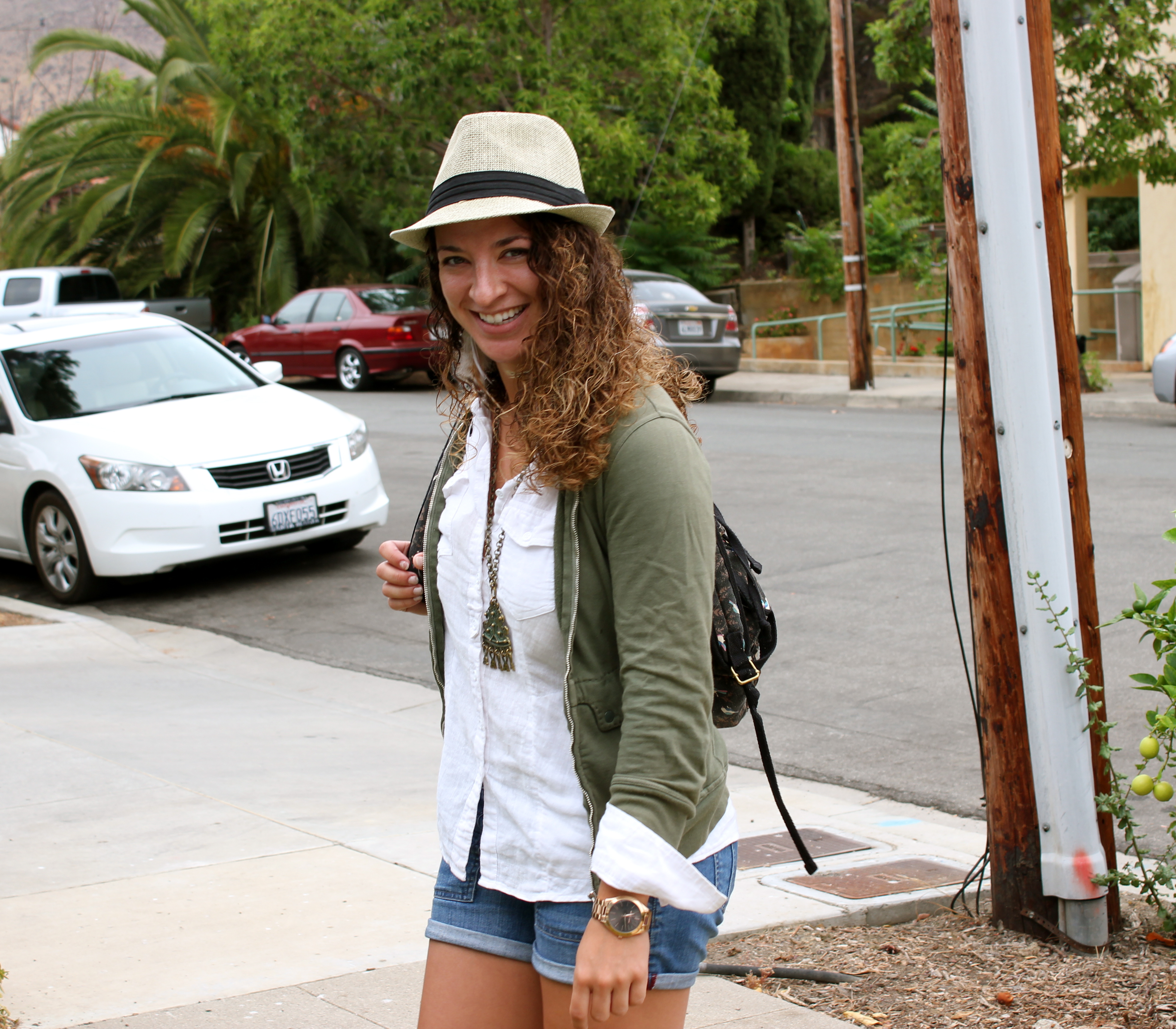 Traveling Days can be cumbersome and tiring. For me, I always want an outfit that is versatile for all temperatures, capable in retaining comfort after walking around all day, and able to withstand travel grime. Since this day I was only traveling within California, I knew I would be ok in wearing shorts, when usually I’d travel in pants or jeans…I love wearing a hat of some sorts as I never know when my curly hair will need to be commanded…Accessories are a must, especially since I refuse putting feather earrings in luggage, getting battered and squished…And I have come to learn that I need a bag which I can tote around all the necessary travel gear without it being a nuisance. This backpack (similar on website) from Target has provided me with such convenience while traveling that I’d recommend it to anyone!
