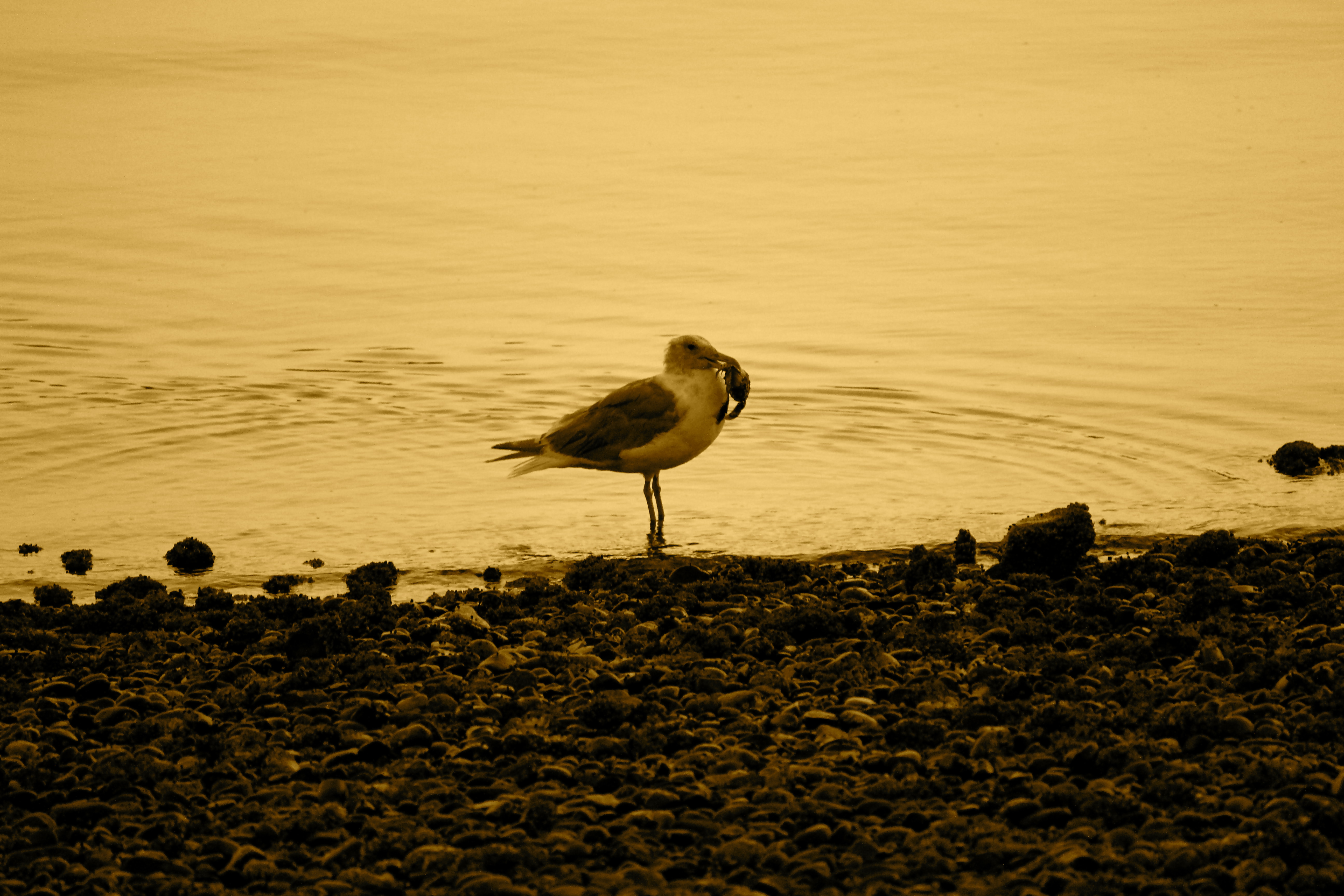 {Top-Bottom: The view of the Pacific from our cabin, table grapes growing from a 100-yr old vine on our deck, seagull with a live crab. }
